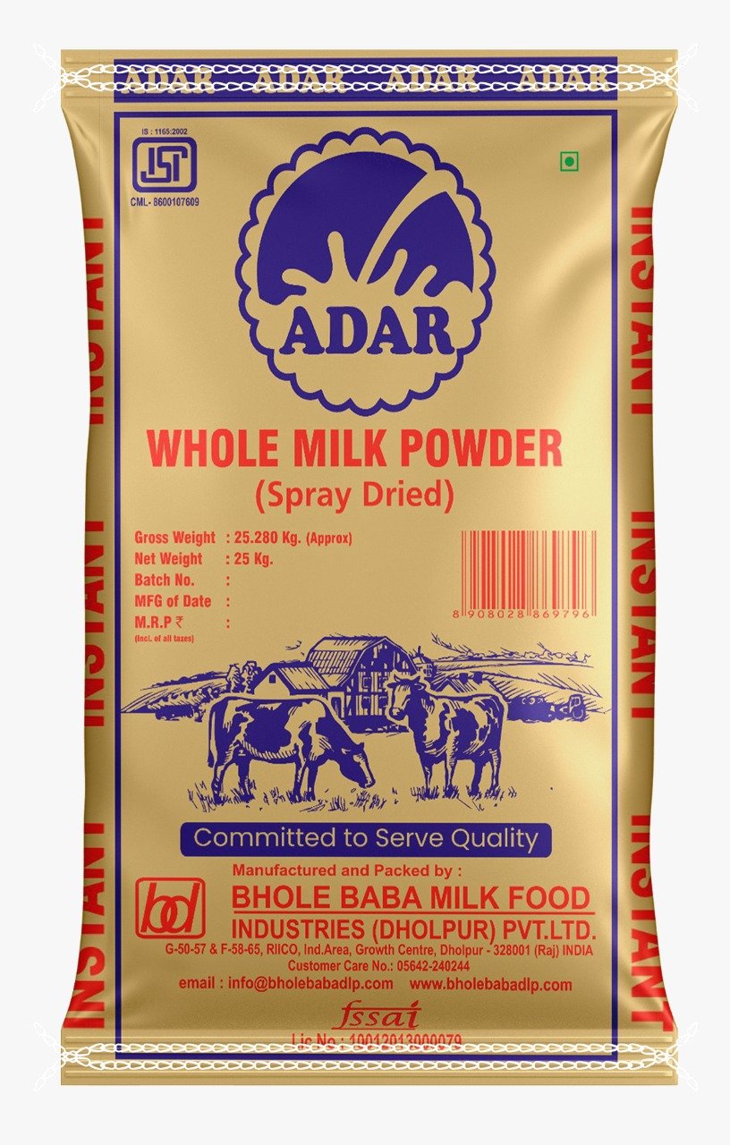 Whole milk powder obtained by partial removable of water from milk. The fat and protein content of milk may be adjusted by addition or withdrawal of milk constituents in such a way as not alters the whey protein to casein ratio of milk being adjusted. It contains 34% of protein and 26% of fat.
